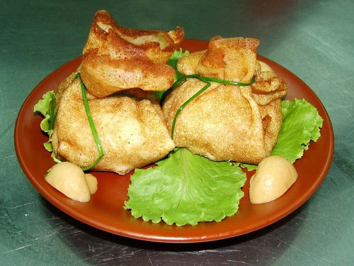 Збирають по краях у мішечок і перев'язують пір'ям зеленої цибулі.