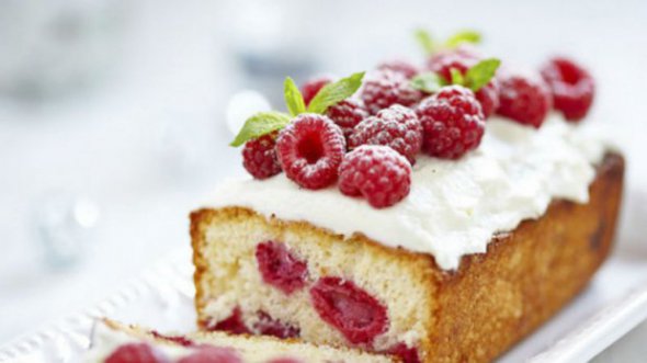 Кекс викласти на тарілку, щедро покрити глазур'ю і прикрасити малиною. Перед подачею поставити кекс на кілька годин в холодильник.