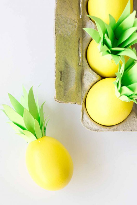 Знадобиться кольоровий папір або трохи штучної зелені, а ще жовта фарба, щоб перетворити яйця в маленькі ананаси.