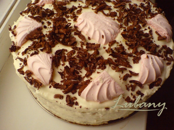 Ніж змочити в гарячій воді і розрізати півкіло зефіру на тонкі пластинки, по 3 з кожної штуки. Фігурні вершинки лишаємо на прикрашання торта. На таріль треба викласти шар зефіринок. Змастити кремом із сметани( 0. 5 літра сметани збити з 1 склянкою цукру). Посипати дрібно порізаними грецькими горіхами. Викладаємо фруктовий шар – апельсиновий (порізаний на маленькі шматочки плід) . Потім знову зефірний, крем і горіхи. Зверзу – шар з ківі чи ананасів. Наступний фруктовий шар може бути з бананів чи натертих на терці яблук, чи навіть журавлини. Кому що подобається. Зверху торт прикрашують фігурними вершинами.