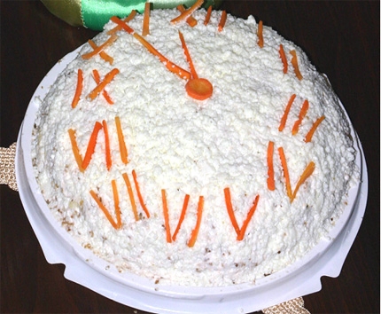 "Салат "Новорічний". В родині ми традиційно готуємо його на Новий рік. На відміну від усіх салатів наступного дня смачніший, ніж у день приготування, бо не містить яєць. Треба змішати кілограм твердуватого зеленого за кольором винограду "киш-миш" із баночкою відвареною квасолі, півкіло порізаного на "кубики" твердого сиру і 3-4 пачками сухариків. Сухарики можна насушити самим з батону. Змастити салат майонезом.