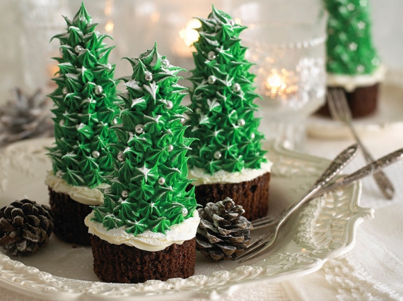 Прикрашати новорічний стіл можна не тільки декоративними іграшками, а й солодкими ялинками. Вони виглядають досить ефектно. Їх роблять з кексів і вафельних ріжків. Зверху прикрашають яскраво-зеленими голочками.