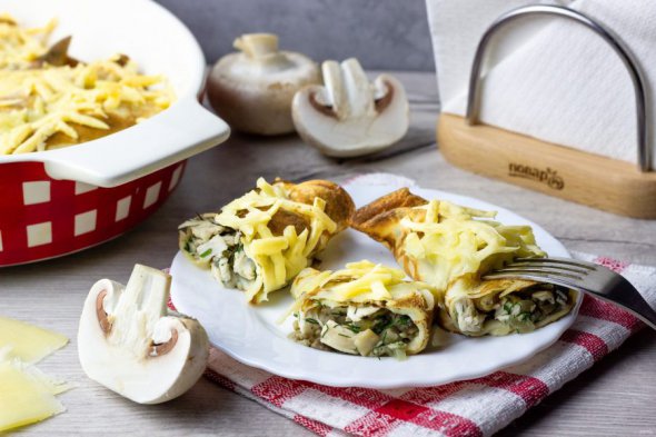 Традиційним сніданкою є млинці. Щоб зробити їх ситними та ароматними, додають курячо-грибну начинку. Усе складають у формі торту і додають заливку.