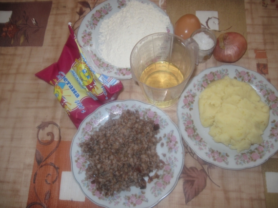 До начинки на соняшниковій олії смажить одну середню цибулину. Картопляне пюре з'єднує з гречкою та цибулею. Сіль та перець додає до смаку.