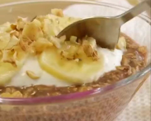 Викладаємо у креманку і прикрашаємо зверху несолодким йогуртом, бананом та горіхами.