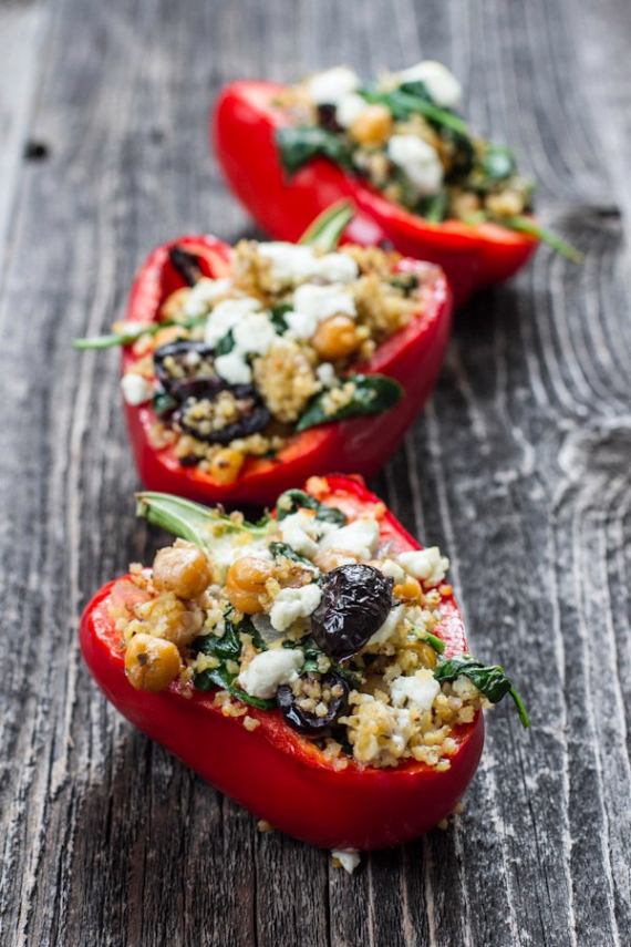 Перець можна фарширувати не тільки м'ясом, а й овочами з сиром. Виходить смачна начинка з родзинкою. Основою в ній є пшоно та нут. Для більш багатшого смаку додають в'ялені помідори зі шпинатом. Пікантною страву робить часник та маслини.