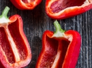 Розігріти духовку до 180 градусів. Викласти на деко, змащені олією, половинки очищених від насіння перців. Збризніути невеликою кількістю оливкової олії.