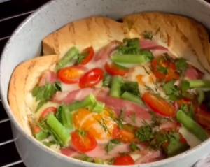 Тортилью відправляємо у форму для запікання, в неї розбиваємо яйця, до них додаємо всі інші інгредієнти.