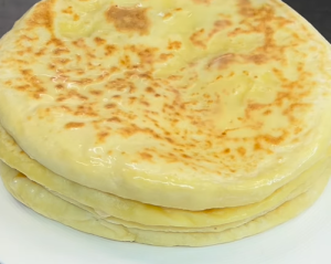 Тісто ділимо на чотири рівні частини та розкочуємо. По центру кладемо натертий сир та складаємо. Ще раз розкочуємо та готуємо на сухій сковорідці на середньому нагріві протягом 2-3 хв з кожної сторони.