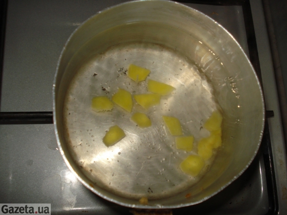 Вона чистить імбир, нарізає його тонкими, дрібними шматочками і кидає в окріп.
