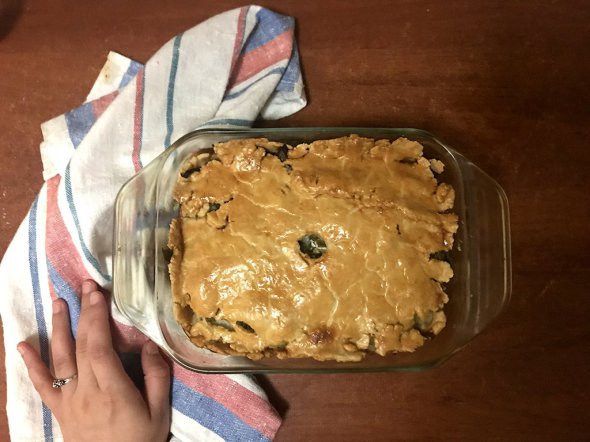 Зробіть отвір посеред верхнього шару тіста (щоб пара виходила під час приготування), і обережно вставте лійку, зроблену з невеликого шматочка щільного паперу. Збийте яйце, а потім помастіть ним тісто. На приготування пирога знадобиться 2 год. Якщо він стане золотистим раніше, накрийте його шматком злегка змащеного пергаментного паперу.