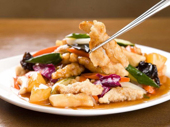 Приготувати кисло-солодкий соус із води, ананасового соку, цукру, соєвого соку й рисового оцту. Перемішати рідину до розчинення цукру.