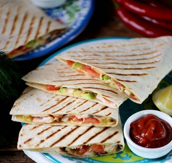 Витріть сковороду паперовим рушником. Збризніть сковороду олією. Розігрійте сковороду на середньому вогні. Готуйте тортилью з начинкою на гарячій сковороді приблизно 2 хвилини або поки тортилья не підрум'яниться, а начинка не прогріється, перевернувши один раз. За бажанням, посипте зверху додатковим піко де гало.