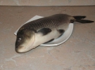 Пані Ніна бере великого жирного коропа і очищає його від луски. Потім робить надріз під головою і виймає всі нутрощі.