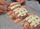 Сосиску розрізаємо вздовж на дві половинки, потім поперек. З одного боку робимо ножем два надрізи. Виходить чотири "лапки" для черепашки. Те ж проробляємо ще з двома сосисками. Ті шматочки, які залишилися - розрізаємо на три частини: кінці сосисок - це "голівки" двох черепашок, а середина - "хвостики". На кожній "голівці" робимо горизонтальний надріз - це буде "ротик".