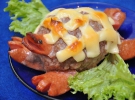 З гвоздики або горошин перцю робимо оченята. Переходимо до панцира. Пластинки сиру нарізаємо смужками. У вигляді сіточки викладаємо на котлету - "спинку" черепашок.