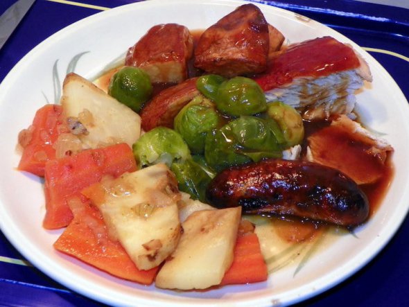 У Великобританії на святковий стіл подають смажену індичку, гусака або курку з різноманітним гарніром - від брюссельської капусти до загорнутих в бекон сосисок і засмаженої моркви. Все покрито ароматної підливою.