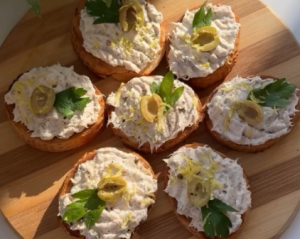 На багет викласти намазку і прикрасити оливкою, листочком петрушки і присипати трохи цедрою лимона.