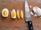 Помідори нарізати часточками і додати до решти інгредієнтів. Потім покласт в тарілку яйця, нарізані скибочками.