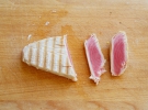 На нього покласти тунець. Перець нарізати скибочками і викласти на тарілку.