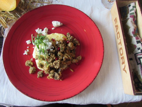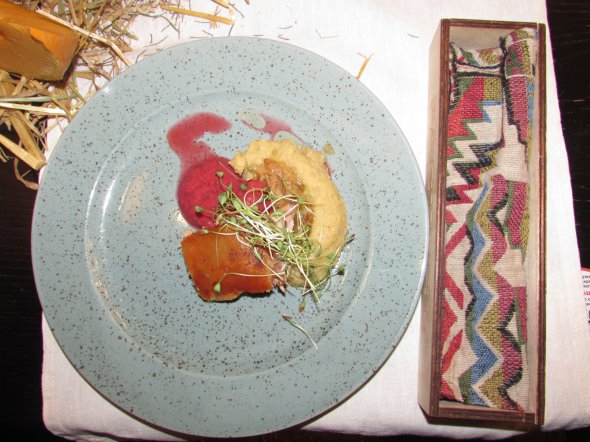 На основну страву з м'яса шеф подає молочне порося з сочевиці та кизиловим соусом.