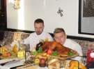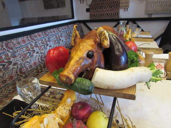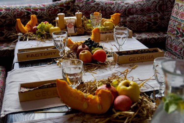 Столи прикрашені розрізаними шматками гарбуза, гранатами, виноградом та хурмою. Все це росте у вільному доступі на батьківщині шеф- кухаря. Але головною окрасою столу є молочне порося у золотисто - медовій скоринці.