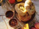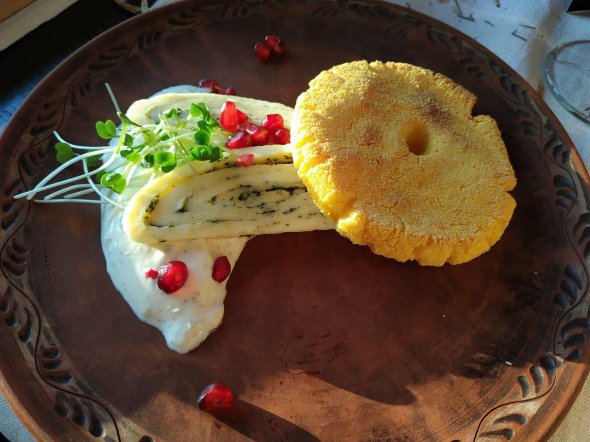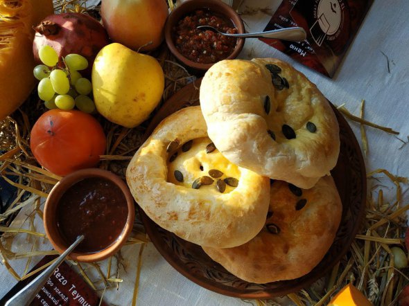 Першими приносять паляниці з гарбузовими дзернятами. До них аджика та соус ткемалі. Столи притрушені сіном, що додає особливого духу усьому приміщенню. Складається враження ніби гості зібрались не в ресторані, а в домашній хатині, де їм дуже раді.