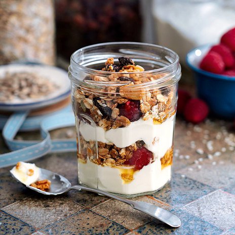 Подавати гранолу и в порційних склянках із йогуртом, ягодами або медом.