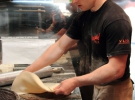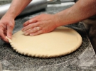 "Розкатуємо тісто на залізній решітці, тоді піца буде правильної округлої форми. По боках тісто має виходити за форму на півтора сантиметри, із нього робимо борт. Однією рукою форму повільно крутимо по колу, а двома пальцями іншої руки загортаємо борти з невеликим наклоном".