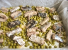 На пекарський папір виклав шар тіста. Потім - шар яєць, горошок і рибу. Зверху посипав смаженою цибулею і порізаною зеленню. Накрив масу тістом і розрівняв його ложкою і виделкою. Форму з тістом поставив у холодну духовку, увімкнув газ на низький рівень і випікав пиріг протягом години.
