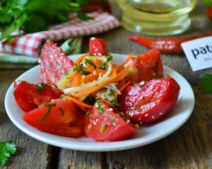 У сезон помідорів можна приготувати відмінну закуску. Вона має пікантний смак завдяки гострому перцю, часнику і зелені. Іноді в неї додають терту моркву.