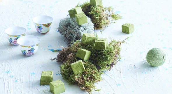 400 г білого шоколаду, 125 мл жирних вершків, 25 г масла, 2 ст. л. матча.