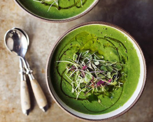 Подавайте крем-суп з броколі та шпинату з крекерами, вершками та кількома краплинами гарбузової олії.