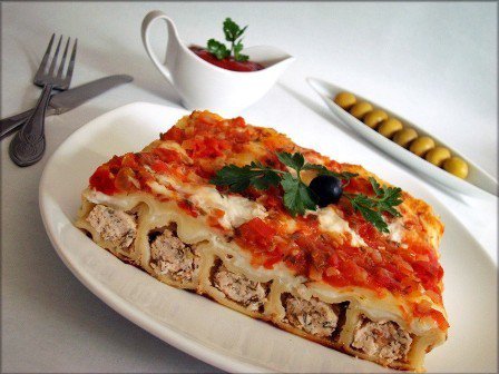 Наповнити каннеллоні начинкою і викласти у форму. Полити соусом і запікати півгодини.