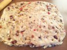 Вимішування може зайняти 10 хв, поки не вийде м'яким тісто. Залишити підходити на півгодини. Після цього додати в тісто всі ягоди, горіхи і цедру лимону. Ягоди попередньо потрібно обваляти в борошні для кращого зчеплення з тістом. І знову поставити штоллен на підхід на 1.5 години.