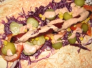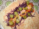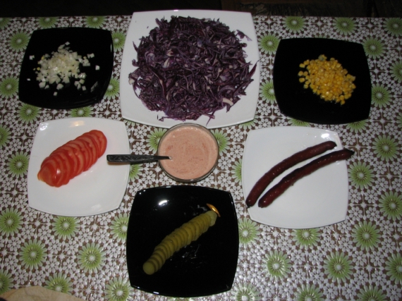 Купили вірменських лавашів, фіолетової капусти, помідорів, мисливських ковбасок, кукурудзи та пішли готувати "швидку" смакоту.
