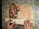 Тонким шаром наносить соус на лаваш. Тоді шарами на ліву сторону лаваша накладає капусту, помідори, огірки та кукурудзу. Кожен шар поливає невеликою кількістю соусу. Останньою кладе мисливську ковбаску, знову поливає соусом.