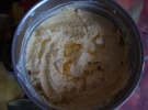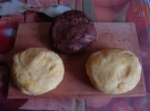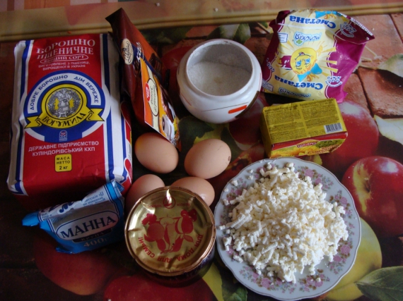 Замісила тісто, розділила його на три частини. До однієї додала 2 столових ложки какао. На годину поставила в морозильник. За той час взялася готувати сирну масу. Півкілограма домашнього сиру перемолола на м'ясорубці. Додала столову ложку манки, стільки ж масла, 1 куряче яйце, півсклянки цукру. Якщо є, додає пачку ванільного цукру, але можна й без нього.