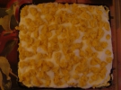 На змащене маргарином деко стелить один шматок білого тіста. На нього ріже 3-4 яблука, посипає цукровою пудрою та корицею. Розкачує коричневе тісто. На нього викладає сирну масу. Зверху - консервовані вишні. 4 білка збиваємо зі склянкою цукру. Заливає поверх вишень. Зверху тре іншу частину білого тіста. Пече на малому вогні приблизно годину.
