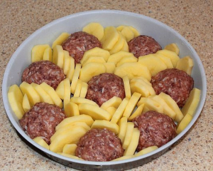 Наріжте картоплю кружечками. Викладіть картоплю і кульки у змащену олією форму.
