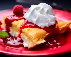 Готову страву перекладіть на блюдо, порвіть його руками, зверху полийте сметаною та варенням.