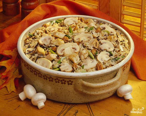 Підготовлену для приготування кашу залити грибним бульйоном. Закрити фольгою та відправити в духовку, попередньо нагріту до 200°С. Страва готується протягом 40 хв.