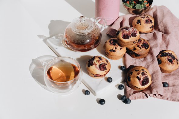 Вівсяні пластівці подрібнити в блендері. Курагу замочити в гарячому чаї на 30 хв. Обсушити й розрізати на невеликі шматки. Горіхи за бажанням обсмажити й подрібнити. Змішати просіяне борошно з вівсяною крихтою, розпушувачем, сіллю, курагою і горіхами. Додати цукор, яблучне пюре, олію і ваніль, ретельно перемішати. Розкласти тісто по формах для запікання, наповнюючи їх на 3/4 висоти. Випікати в попередньо розігрітій до 180°С духовці до сухої шпажки. Подавати гарячими.