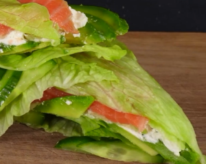 Листя капусти розріжте так, як показано на відео - на пополам, але не дорізаючи до кінця. На край кожної частини покладіть начинку - сир, рибу, огірок, авокадо. Посипте сіллю та кунжутом.
