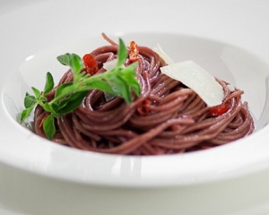 Зі звичних спагеті можна зробити ресторанну страву, додавши червоного вина. Виходить пікантний смак та оригінальна подача. У спагеті кладуть куряче філе з червоним меленим перцем. Зверху посипають порізаною петрушкою.