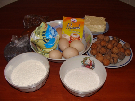 Для торта жінка пекла три коржі. Для кожного з них брала одні й ті ж продукти у тих ж пропорціях. Лише у перший корж додавала півсклянки чищених горіхів, у другий — стільки ж родзинок. Третій був із запареним маком.