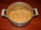 Крем готує з 300 г масла та банки згущеного молока. Усе добре збиває міксером. Коли коржі охолонути, перемащує кремом. Верх та краї прикрашає родзинками, горіхами. Можна зробити квітку з кураги. Готовий торт на добу ставить у холодильник.