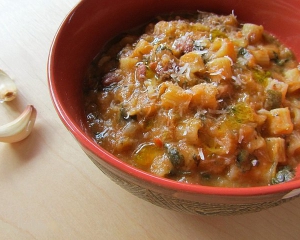 - На вогонь ставлю велику сковорідку, заливаю 3 столові ложки оливкового масла і добре розігріваю. На гарячу посудину висипаю усі нарізані овочі і смажу їх 5 хвилин. Солю, додаю перець на кінчику ножа. Заливаю 200 грамами води і тушкую овочі 20 хвилин, доки не стануть м'якими. Мілко ріжу 2 зубці часнику і додаю до суміші.