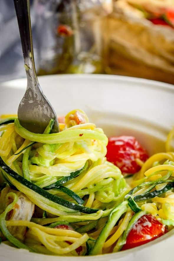 Кабачок нарізати овочечисткою на слайси, потім соломкою як спагетті, обсмажити на вершковому маслі. Додати сіль, перець, сметану й крем-сир. Тушкувати 5 хв - ніжно, як у ресторані.