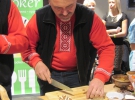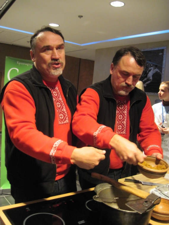 На Фестивалі здорової їжі Best Food Fest&Health украінські письменники брати Віталій та Дмитро Капранови готували кашу з сокири. Ставлять казанок з водою на плиту. Кладуть туди сокиру.